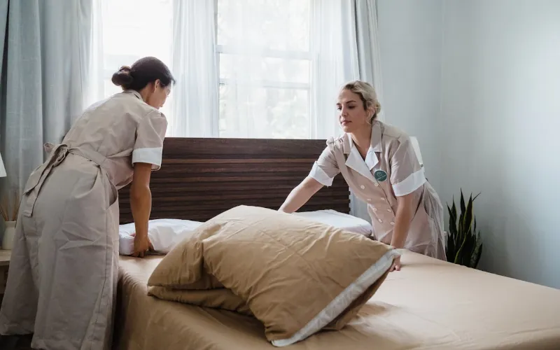 Une femme de chambre s’occupe du nettoyage ainsi que du rangement d’une chambre d’hôtel après que le client soit parti. Elle s’occupe de mettre de nouveaux linges, de faire le lit et le ménage. Elle se charge aussi de remplacer tous les consommables de la chambre (serviettes, savon, shampoing, etc.).